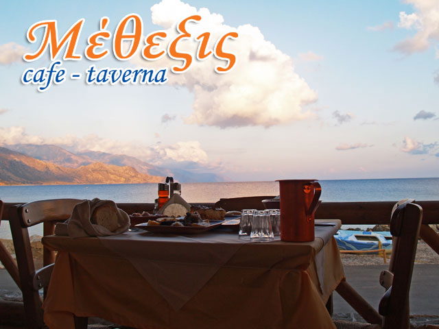 Μέθεξις, όπως λέμε επικοινωνία… Η φιλοσοφία μας όπως και στα περισσότερα εστιατορια στην Κρήτη, είναι πολύ απλή. Καλή Κρητική παραδοσιακή κουζίνα. Καθημερινά θα βρείτε πάνω από δέκα διαφορετικά πιάτα από μαγειρευτά. Όλα φτιάχνονται με ντόπια αγνά υλικά. Είναι αυτό που δεν μπορείς να πεις με λέξεις…